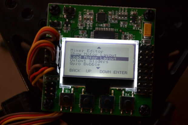 Así que, ahora que entendemos cómo navegar el KK2.1, se carga el motor diseño. En primer lugar, pulse el botón de la extrema derecha para entrar en menú.
