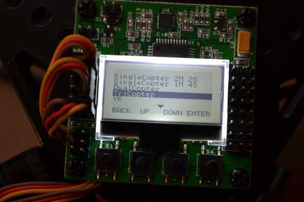 Hay un montón de diseños de motor incluido con el firmware KK2.1, esta es una de las cosas más cool de la KK2.1, que puede controlar muchos tipos de multirotor. Por ahora, desplácese hacia abajo hasta "Tricopter" y presione el botón Enter de extrema izquierda.
