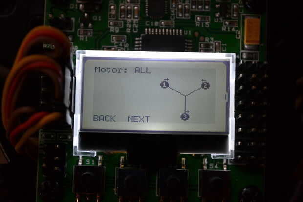 Con tres CES todos conectados a los KK2.1 en los lugares correctos, la última conexión que tenemos que hacer es la conexión del servo. Una vez más, el diseño del motor de KK2.1 nos dirá dónde conectar el servo. Con la distribución del motor en la pantalla, presione el botón "Siguiente". Esto nos da alguna información adicional sobre el Motor 1, específicamente la dirección de giro. Pulse "Siguiente" dos veces más y descubrirá que Motor 4 es para la conexión del servo. Si continúas pulsando siguiente, usted también encontrará que las restantes cuatro salidas motor están sin usar.