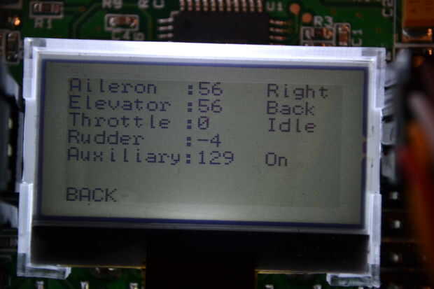 Bien, comencemos. Primero, encienda su transmisor y, en el menú KK2.1, seleccione receptor test intente mover los palillos en la emisora. Debería ver los valores en el cambio de pantalla de prueba de receptor al mover los sticks. En las secciones a continuación, observaremos estos valores al mover los sticks y realizar cambios en la configuración del transmisor según sea necesario para conseguir las direcciones correctas para los controles.