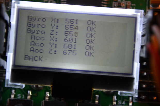 Así, en el menú KK2.1, vaya a la herramienta de prueba de Sensor y presione el botón Enter. El KK2.1 tiene dos tipos de sensores a bordo: un giroscopio de 3 ejes, que detecta la rotación de la nave alrededor del rodillo, echada y desvío hachas, y un acelerómetro de 3 ejes que detecta la aceleración de la nave en las tres direcciones. La herramienta de prueba de Sensor debe listar los tres ejes de estos dos sensores. Que verá que el estado de las seis líneas aparece como "Aceptar".