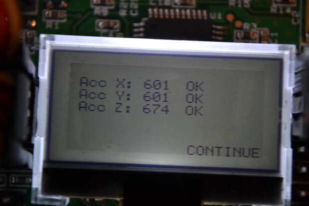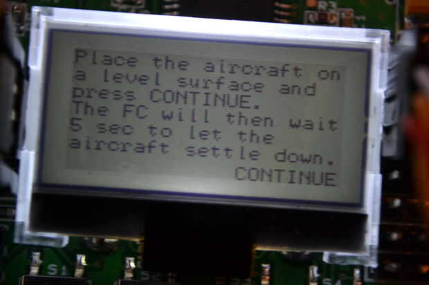 Ahora que hemos realizamos una prueba de sensor para confirmar todos los sensores a bordo del KK2.1 están funcionando como se esperaba, ahora nosotros podemos calibrar el acelerómetro.