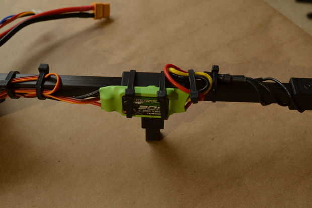 Mientras hemos sido conectar varios componentes y conexiones eléctricas no nos hemos molestado mucho con enrutamiento de cables. Sin embargo, obviamente no queremos que un montón de cables sueltos colgando alrededor cuando volamos porque los cables podrían encontrar su camino en las hélices. Eso sería malo.