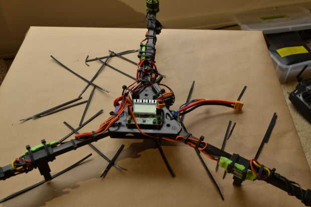 Así que tenemos que fijar los cables sueltos para asegurarse de que no son tirarse sobre. Este proceso es un poco subjetivo, pero también no es muy difícil. Sólo tiene que utilizar un montón de ataduras de cremallera para sujetar cables hacia los brazos y el eje. También, si quieres, puedes envolver los cables alrededor de los brazos o pegarlas a través de orificios. Hacer practicar y jugueteaban hasta que todos los cables se sujetan muy bien.