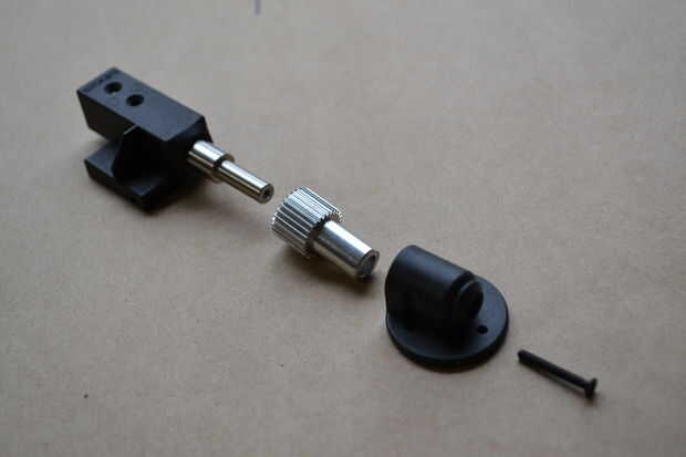 - Encontrar la pieza de plástico más grande, el eje de metal y uno de los tornillos de longitud media. Presione el eje metálico en la pieza de plástico. Debería ver que la forma del metal eje coincide con la forma del orificio en la pieza de plástico. A continuación, inserte el tornillo a través de la abertura en la pieza de plástico cuadrada y enrosque en el eje metálico.