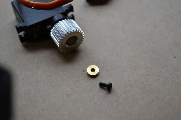 - Pulsa el pequeño engranaje de metal sobre el cuerno del servo. Entonces, encontrar el buje pequeño de latón y el tornillo pequeño. Inserte el buje de bronce del engranaje del metal. Por último, utilice el tornillo pequeño para enganchar el engranaje de metal para el cuerno del servo. Entonces apartar el servo con engranajes acoplados.