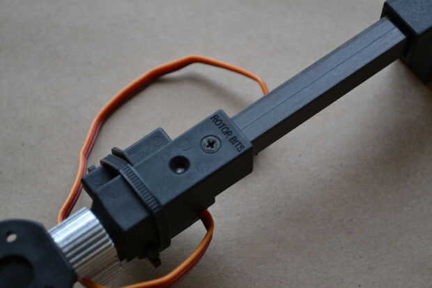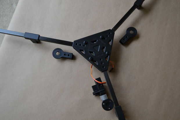 Ahora que tienes los brazos tricopter conectados el hub, los montajes de la pierna de aterrizaje colocados en los brazos y el servo de Rotor pedacitos montaje montado, podemos conectar los tres soportes del motor (uno de los cuales es el servo montaje) a los brazos de tricopter.