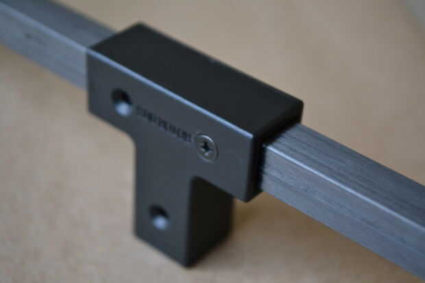 Luego, una vez más, usar los montajes de la pierna de aterrizaje como plantillas de perforación para perforar agujeros en los brazos de tricopter. Opté por usar sólo un orificio para cada conector T porque realmente no hay ninguna fuerza que se aplica a la conexión.