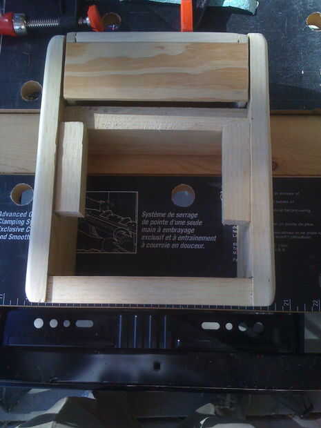 Con la cabeza y los lados completa, tenemos que cortar un trozo medio e inferior para montar el cuerpo. La media e inferior deban ser ligeramente más largo que la longitud de la cabeza, aproximadamente 1/8 de pulgada. Corte dos piezas idénticas del pino de 3/4. Las placas frontales y traseros del tricorder son sólo un par de trozos de cartón de 1/4 de pulgada, así que tenemos que reducir un poco el grosor. La placa inferior se reduce en 1/4 de pulgada en cada lado, por lo que termina por 3,25 pulgadas de profundidad. Usé un poco de barra de toalla barato de 5/8 de pulgada de aluminio como una barra transversal, así que la placa media se reduce a 2 5/8. Utilizar los bits sobrantes como bloques de pegamento. Prueba con la cabeza y luego hacia arriba.