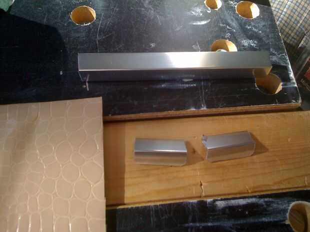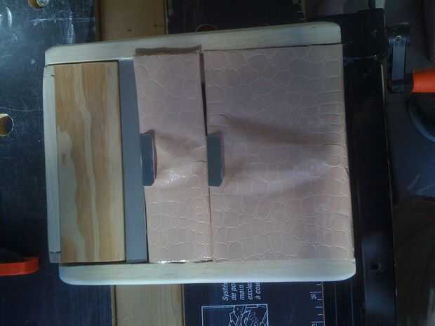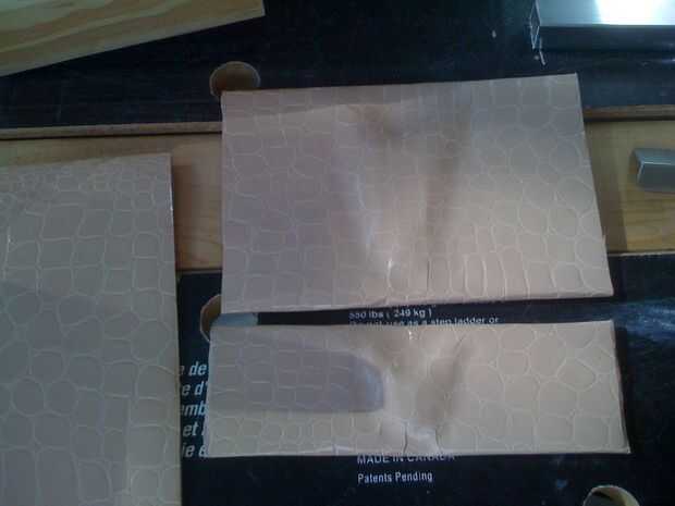 La parte delantera y trasera de la placa son cartón sólo ondulado, vestido para arriba con un poco de papel de textura. El Tricorder en la serie original tiene una variedad de texturas superficiales - kydex haircell, vinilo, cuero, pero mina es real imitación piel de Gorn. Cortar las molduras de"delta" de cartón así. Mi placa es aproximadamente 5.75 x 6 pulgadas, y las placas delanteras son 5.75 x 3,75 y 5,75 x 1.75. Cubrió cada plato con una capa del palillo del pegamento y utiliza el mango redondeado de un destornillador pequeño para pulir los bordes del diseño moldeado. En este momento se debe también cortar algunos tiradores de las puertas de aluminio acción de barra de toalla. En la serie original hay un par de variaciones. Mina son aproximadamente 1.5 x.5 pulgadas, que es un poco grande. Cortar unas ranuras para las manijas y dry fit. Las puertas de mi tricorder son no funcionales, pero podría les bisagra y construir los compartimientos interiores si tiene la inclinación.