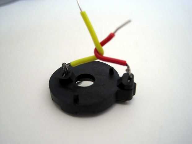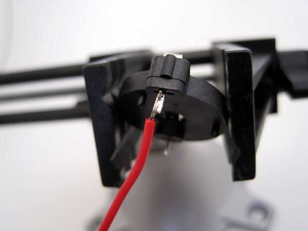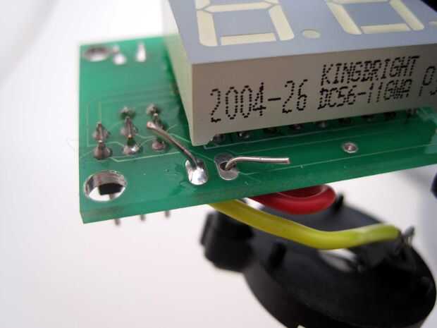 Los otros extremos de los cables hasta el lugar en el tablero marcado JP1 de la soldadura. Asegúrese de que el cable positivo va a la + símbolo y la negativa de alambre en el - símbolo.