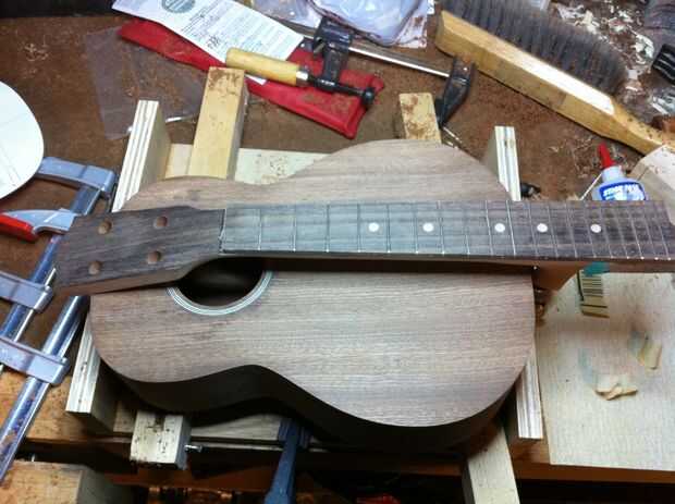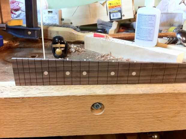 Los trastes se añadirá a los trastes antes de que se pega al cuello. Los trastes vienen como un pedazo largo de alambre de traste, que es martillado suavemente en las ranuras de los trastes. Luego los extremos recortados y alisados con un archivo.