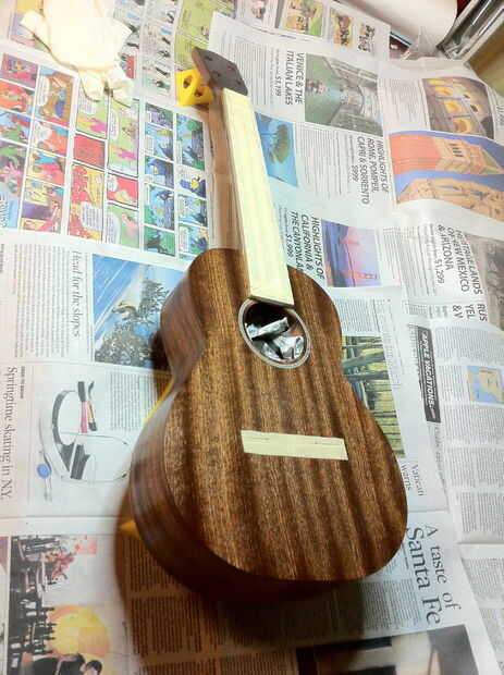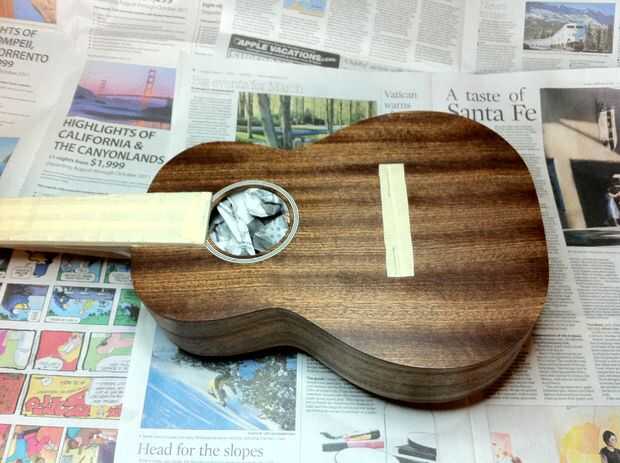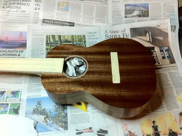 Después de que el cuello se une, enmascare el diapasón y el lugar donde se unirá el puente con cinta de enmascarar. Muy importante no se acabado donde se pega el puente en y no se pegan!
