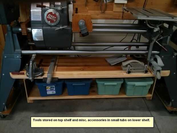 Es básicamente una caja (2 estantes) que cuelga de la estantería superior más largo. Una serie de ranuras, agujeros y clavijas Mantenga los accesorios utiliza con más frecuencia. Los otros ShopSmith piezas y herramientas se almacenan en cuatro contenedores Rubbermaid pequeño en el segundo estante. El cepillo pesado y lijadora de banda se colocan en los agujeros en la parte superior de una pequeña mesa que construido específicamente para obtener estos elementos del suelo.