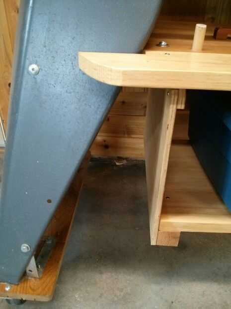 Dos tornillos a través de cada pierna de la Shopsmith sostienen 6" bloques de madera (2 X 2) que actúan como ayudas de estante para el estante superior de la caja.