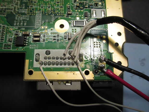 ¿(Agregue un disco duro interno a tu Wii? Si es así, ahora la soldadura cable del USB del disco duro a los conectores USB de la Wii. El conector USB está cerca de la parte posterior de la parte superior de la placa base y tiene una cuadrícula de 2 x 4 de pines)