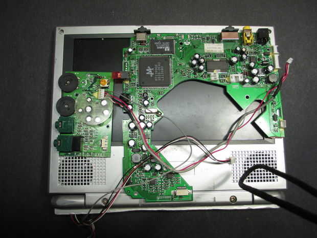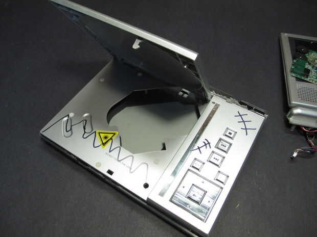 Saque un sharpie y marca las líneas en la parte inferior la mitad del reproductor de DVD que separa las bisagras (y una tira de plástico conectado a las bisagras), el resto del reproductor de DVD. Luego, cortar a lo largo de ellos con su Dremel hasta que esa zona quede libre. El resultado final debe ser muy triste buscando reproductor de DVD y una pantalla totalmente separada (con bisagras). Mantener la pantalla con el resto de la circuitería. Nos va a regresar a él pronto.