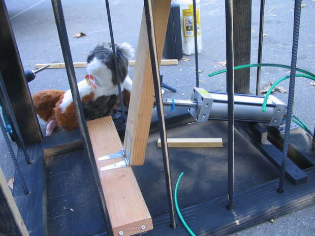 Poner un 2 x 4 en una bisagra y lo ató con innertubes al pistón. 2 x 4 entró al títere como una mano.