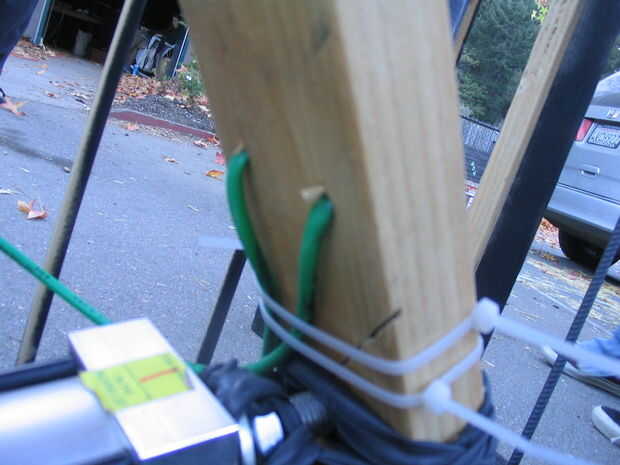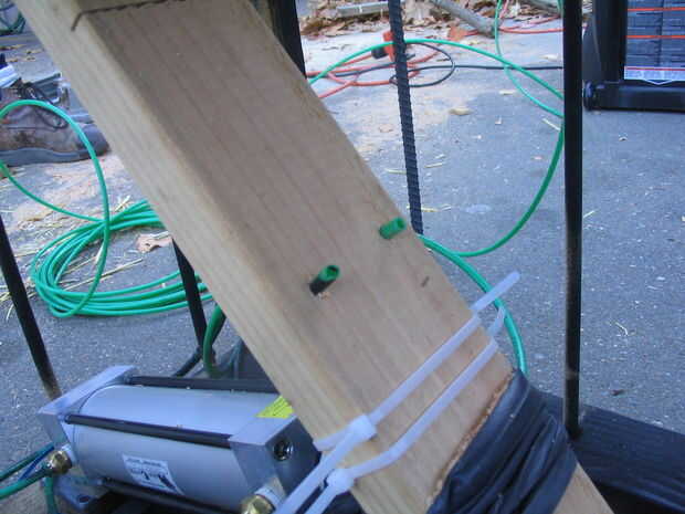 Justo debajo de la marioneta, taladre dos agujeros y alimenta las líneas aéreas a través de la 2 x 4. Conecté estas líneas aéreas para puerto de ventilación de la válvula. En esta configuración, habría una ráfaga de aire como el cilindro extendida o retraída. Ya que las líneas aéreas fueron en el 2 x 4, como marioneta movido, las líneas aéreas barrido hacia fuera un arco y asegúrese de soplar en las personas de todas las alturas mirando hacia la jaula.