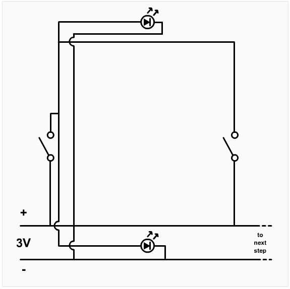 Las cosas fueron más complicadas aunque cuando he tenido que averiguar cómo funcionar el cableado para que los interruptores y las luces en los lugares deseados. Después de doblar el esquema alrededor, el circuito para cada paso se convirtieron en más complicada (segunda imagen).