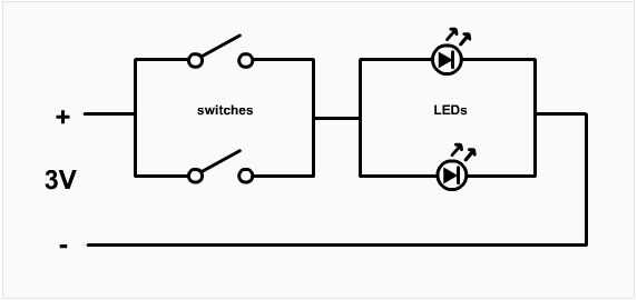 A través de prueba (las especificaciones no publicadas) los LEDs que compré necesitados alrededor de 3 voltios. Ya los LEDs en paralelo y cada paralelo del paso uno con el otro, he encontrado que podría correr la cosa entera apagado sólo dos pilas AA (en serie). Agrego un segundo conjunto de AA en paralelo, para asegurar la larga duración de la batería, pero no era necesario ya que los bulbos son generalmente sólo durante períodos cortos.