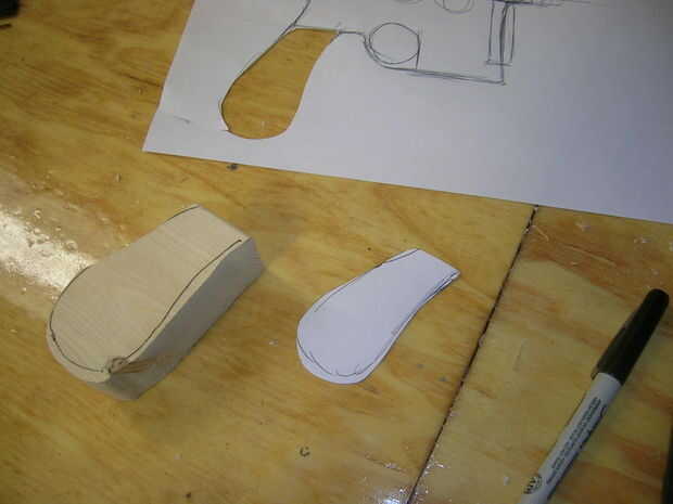 que utiliza piezas de madera para el mango, pero no estoy seguro si esto funciona hacia fuera estoy pensando en usar una pieza de mdf y la hacen hacia pedazos así que más de un mango redondeado de una plana. para mi diseño sólo busqué algunas fotos de referencia en la red. uno de los sitios que dan ángulos alternativos es thedentedhelment.com. Pero después de un estudio de la pistola pudo dibujar un dibujo 2-d para que quepa mi mano. para distintas piezas Corte fuera del cuadro y el trazado sobre la madera utilizan para esa pieza específica. (como se muestra con el asa)