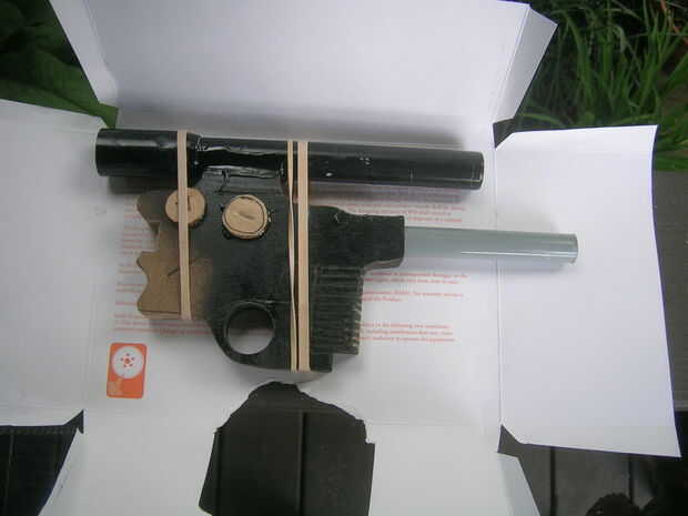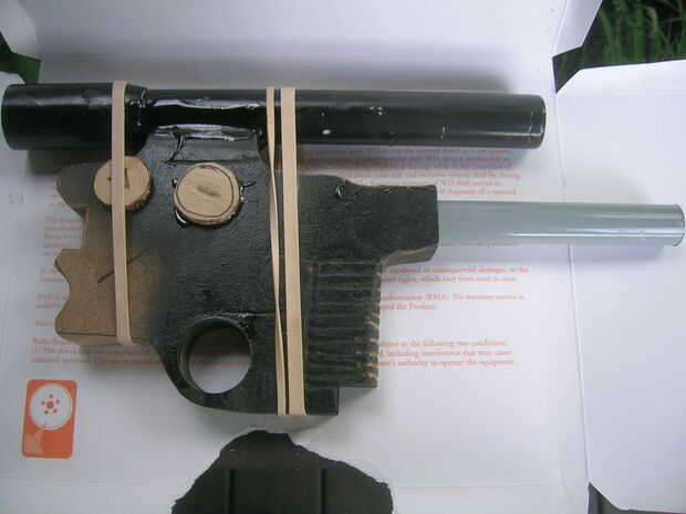 todos utilizan para el cañón fue otro pedazo de tubo de metal. Usé una broca para perforar en el frente donde se deslizará el cilindro pulg después de que llegué a este punto explotó el epoxi y ajustaron todos los pedazos juntos excepto el mango