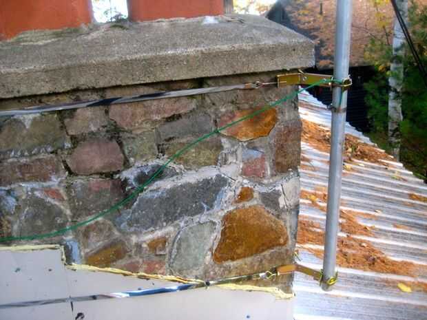 La primera imagen muestra una de muchas maneras que se puede hacer. Tengo una chimenea sin uso que es grande y fuerte. Opté por un sistema de chimenea. Consta de dos soportes de esquina y las correas de acero inoxidable que van alrededor de la chimenea. Tensor tipo pernos permiten apretar. El montaje es fuerte. También puede obtener monturas de techo en varias configuraciones. Uno de los mejores y menos invasivos son los soportes que se montan en el lado de una casa en la cima. Agujeros en el techo y no se pueden atornillar en madera sólida.