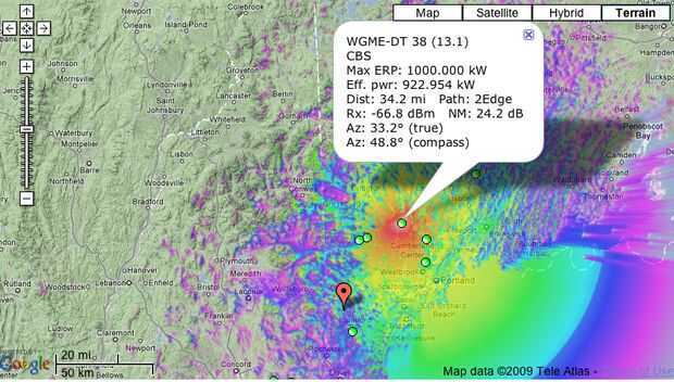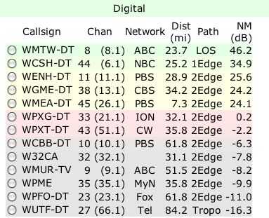 También verá una lista de las estaciones en su área. Si eliges uno que verá un color codificado mapa de intensidad de la señal de la estación a su lugar. La lista muestra la distancia en millas y y el importante margen número de NM o ruido. La antena que estamos haciendo debe tener una ganancia de al menos 15, esperemos que más. Pensar en el NM como la pérdida de la señal a tu casa. Podría ser colinas, hojas, paredes o tiempo. Es también distancia y situación de la torre de la señal. El objetivo es obtener una ganancia neta de al menos 0. A cero, obtendrás una señal. Para una señal confiable un número más alto es beneficioso. 5-10 medios probablemente obtendrás una señal sobre consistentemente 0.