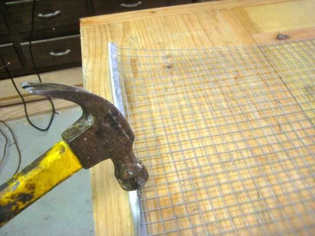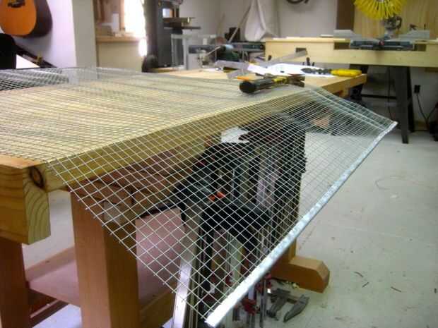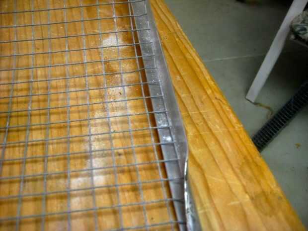 Desenrolle la 40 pulgadas (para la altura) y cortarlo con unas tijeras. Para reforzar los lados (40" lado) usé fino 1/4" ancho ángulo aluminio recorte. Coloqué un lado bajo la malla y había golpeado encima con un martillo.