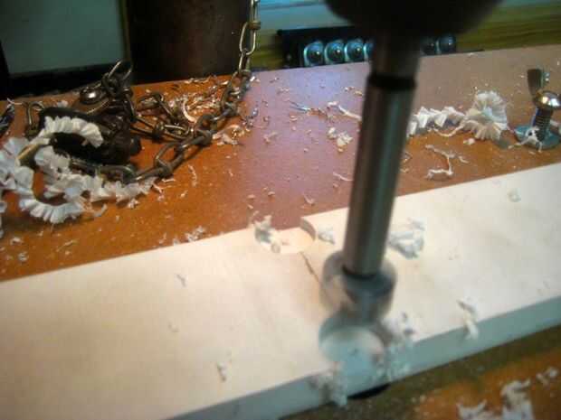 Utilice un taladro grande (pieza Forstner funciona muy bien) para perforar un hueco para cada uno de los ocho wiskers. Utilice los diagramas del paso dos para determinar la distancia que deben ser. Sobre un 1/4" profundidad debe ser suficiente. Observe que el receso está del lado de la rodillera. Esto es para acomodar los wiskers sobresale.