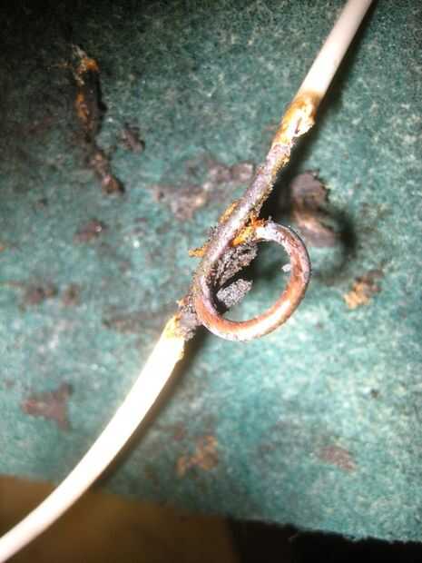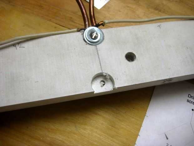 La V de la barba en el hueco del asiento, coloque el bucle del cable fase línea sobre él, añadir un tornillo con las arandelas en ambos lados y apretar en su lugar apretando la tuerca. Lo mismo para todos los 8 bigotes.