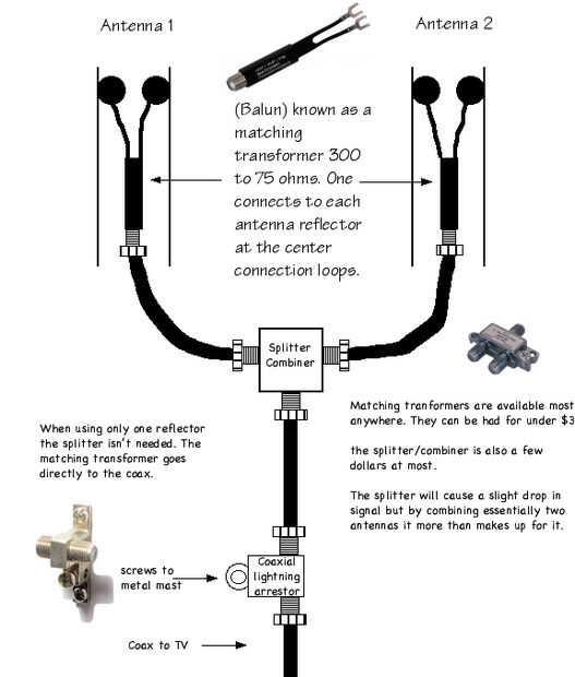 Si usted acaba de hacer una antena entonces usted necesitará solamente el balun, pararrayos y los cables coaxiales. Conecte los dos conductores de balun para el centro también lazos de la línea de fase de antena. Conectar con tornillo, tuerca y arandelas mantienen suelto o taladran y tornillo a la Junta de destacado si quieres. Conecte el otro extremo a un cable coaxial corto. Atornille un pararrayos a la tubería y conecte el otro extremo del cable coaxial. El otro terminal en el pararrayos va a la caja convertidora de televisor o DTV.