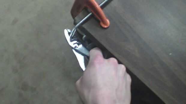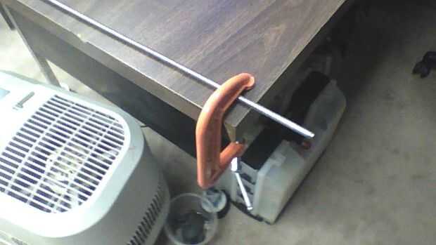 Utilizar el C-Clamp para sujetar el hilo de todos a la mesa de trabajo.  Deje unos 2" sobre el borde de la mesa (Foto 1)