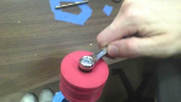 1 Coloque la tuerca de mariposa del hilo todo al revés (Foto 2).  Si desea, puede poner una arandela en la parte superior.