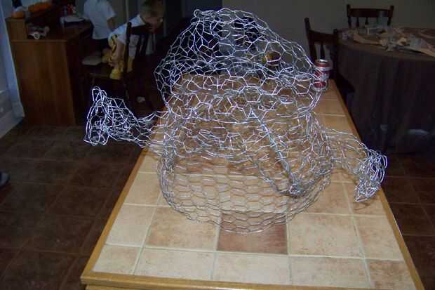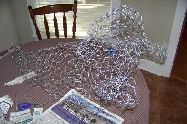 3) mojar tus las tiras de periódico en el yeso y capas comienzan en el armazón de alambre de pollo.