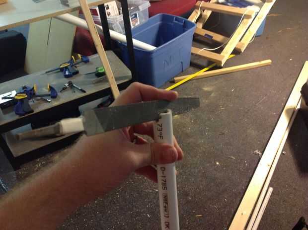 Corte el tubo de PVC de 10' restantes en tres tubos de 3'. Puede utilizar el pie restante del tubo en otro proyecto. Empuje los tapones en el tubo; No necesito estas de cemento. Utilice el archivo "cortar" las muescas en el otro lado de la tubería (cuadro 2). Esta parte tendrá la cuerda. Más tarde aprendí que es útil para envolver una pequeña cinta en el extremo enmuescado también, para minimizar el agrietamiento después de que los pernos han sido despedidos repetidas veces.