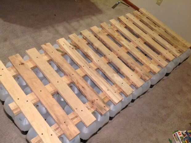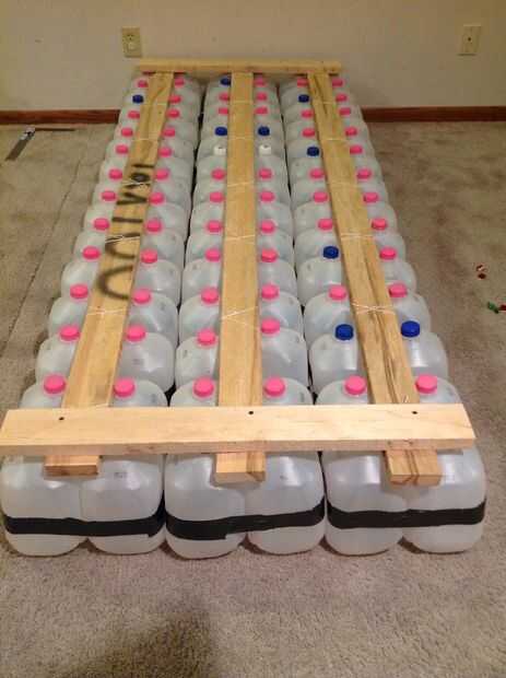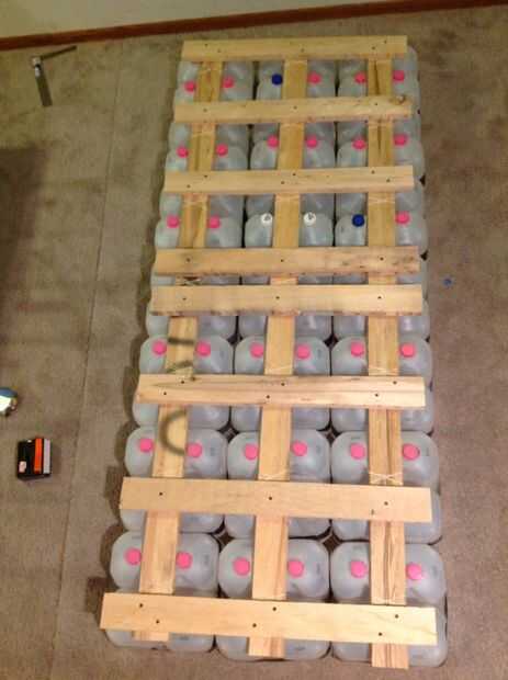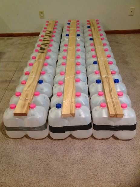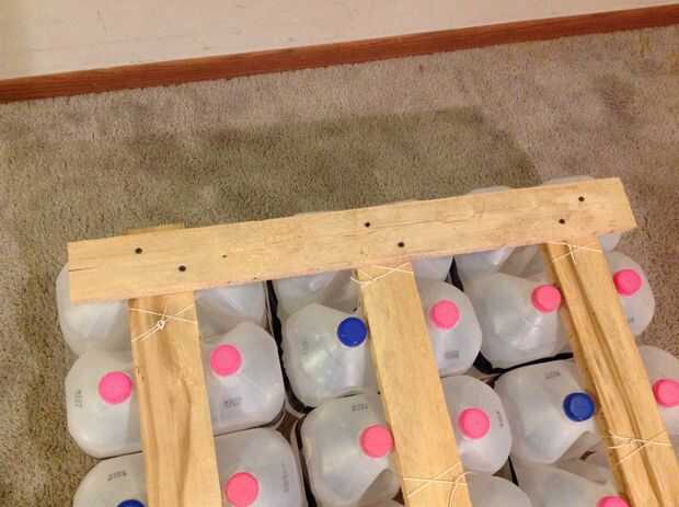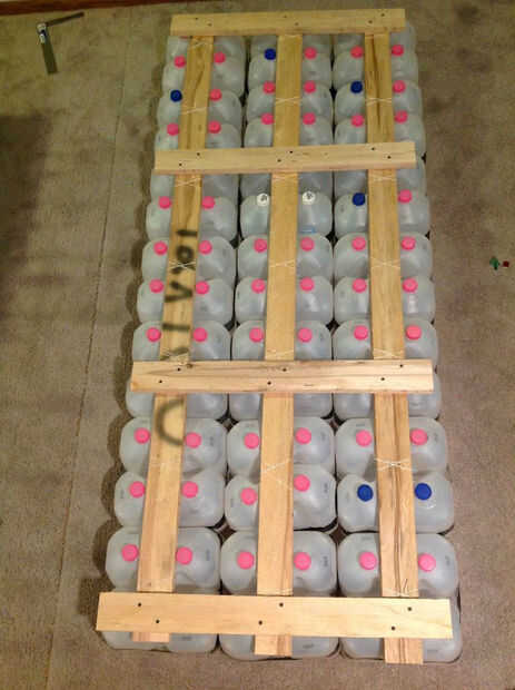 Una vez que tenga todos sus pontones hechos, alinearse según su diseño y medir las distancias que debe cubrir con planchas. Para mí, puesto que mi balsa era un rectángulo, fue prettty fácil - solamente un puñado de 32" 2x4s. Si planea tener una tabla por fila de jarros de leche - es decir, he utilizado 14 tablones tuve una matriz de 6 x 14 de jarras de leche. Las tablas sirven un propósito triple - proporcionan un agarre superficial, de estar caminando el pontón junto y presione hacia abajo en los casquillos de la jarra de leche (que son ligeramente sobre la superficie de los tableros del pontón) para ejercer tensión en la cuerda y evitar que los jarros de leche tirarse alrededor. Cuando haya determinado el número y la longitud de las tablas necesitada, cortar. No tienes que usar 2x4s - podría utilizar tablas más delgadas para menos peso.