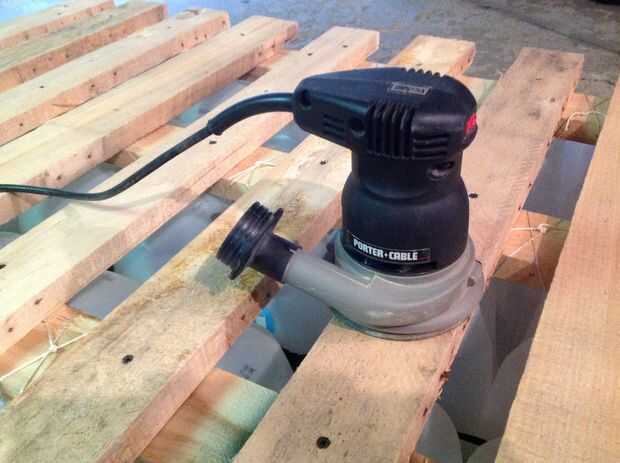 Una lijadora orbital hará su trabajo mucho más fácil, pero también se trabajará el papel de lija. Comencé con grano 80 y luego subió a un grano 120 para un acabado más liso. La diferencia era bastante evidente, y me sentía mucho más confiado acerca de sentarse en él y no hacer astillas.