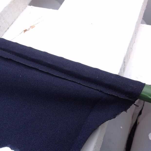 Encontré que un juego de jardinería trabajó bien como mi bandera. Si no tienes uno, acabo de comprar una barra de pasador. Para asegurar la bandera a la poste, doblar un extremo sobre el poste por lo que lo envuelve, pin y coserlo. En el cuadro 7 se aprecia la puntada final.