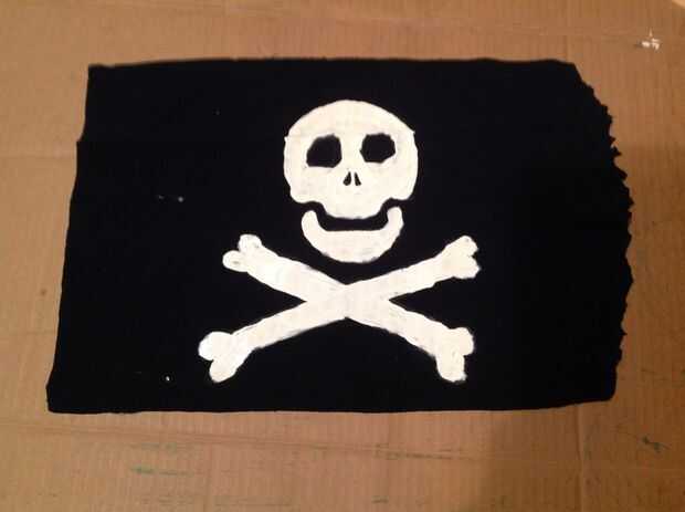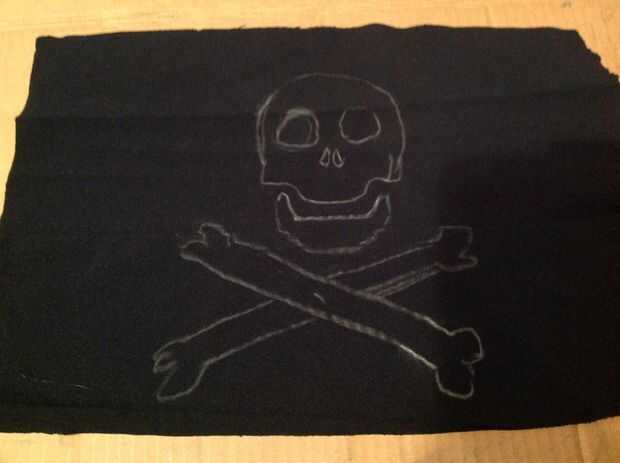 Para hacer su bandera (no tiene que ser un Jolly Rodger), tomar un trozo de tela o un par de pantalones no deseados y cortado a la medida. Usé unas de 16 "x 12". Luego, si se quiere la calabera terrible, coloque un extremo de la misma y cortar con unas tijeras para hacer un borde jirones para efecto. Si es sintético, fusible ligeramente los bordes con un mechero para evitar que se deshilache.