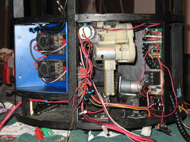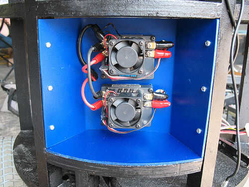 Un par Victor 883 de Controladores de velocidad se utiliza para controlar los motores impulsores de BaR2D2 y está configurado para la dirección del "estilo tanque". Nota: para facilitar la conducción, hemos creado el transmisor hasta uso un stick para el control de la unidad (función de mezcla). Siga las instrucciones incluidas con los controladores de velocidad para la instalación y configuración. Éstos fueron montados en un pedazo de Sintra.