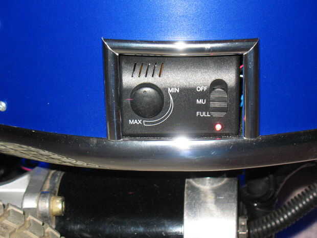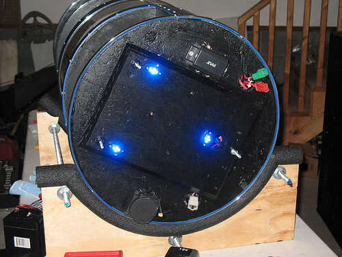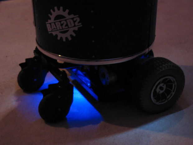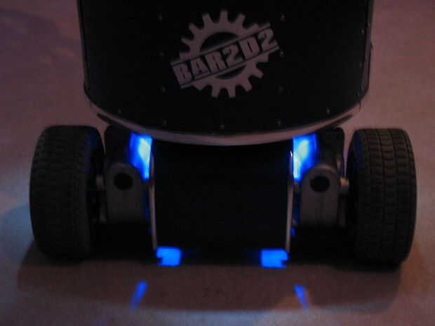 Para mejorar la iluminación, un conjunto de tres vainas de LED azul (12 voltios) fueron Unidos a la parte inferior del cuerpo de robot. Comúnmente se utilizan para iluminar motocicletas y emitir un suave resplandor azul en el robot. Nota: éstos no fueron instalados aún cuando fue tomado el video.