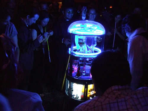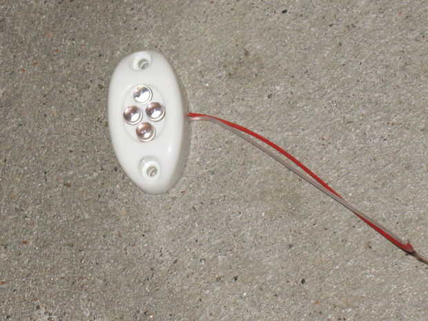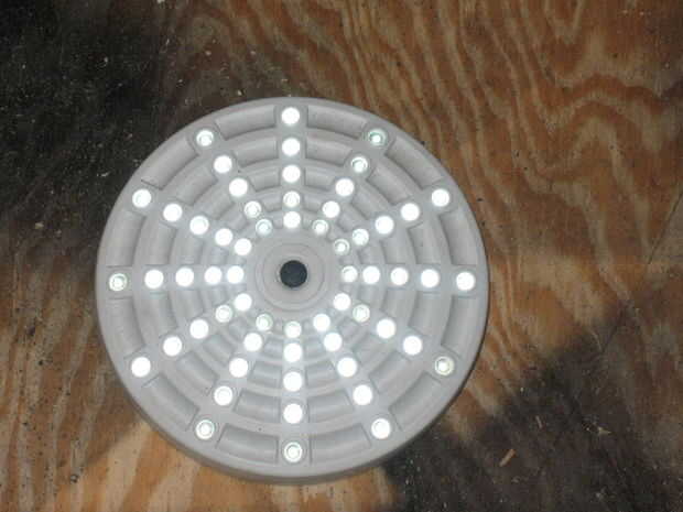 Las cervezas están iluminadas por una luz de camping que tiene 60 bombillas de LED blanco (ebay). Esto fue unida con Velcro en el techo. Para mayor brillo, un círculo blanco de Sintra se cortó con el router y el contacto cementado en el techo de la zona de la cerveza.