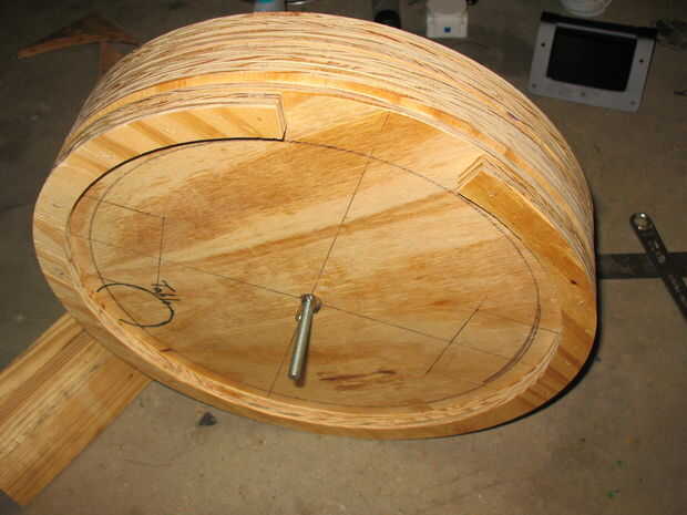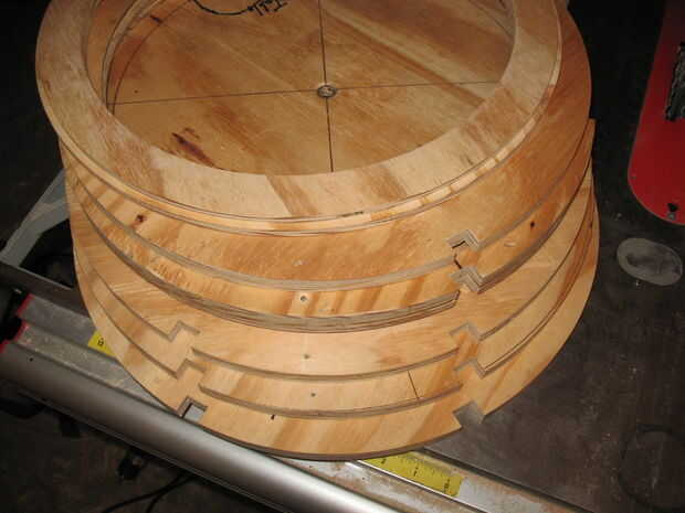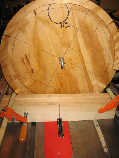 Para cortar las ranuras en los círculos, apilados a ellos, poner un tornillo en el medio para mantenerlos juntos, luego sujeta entre dos bloques y funcionó a través de la hoja de ranurar como muestra la imagen. Igualmente se espaciarán las seis columnas alrededor de todo el camino. Nota - tomar nota de los cuadros en otras medidas como algunas de las piezas se consigue cortar lejos para permitir que el cajón.