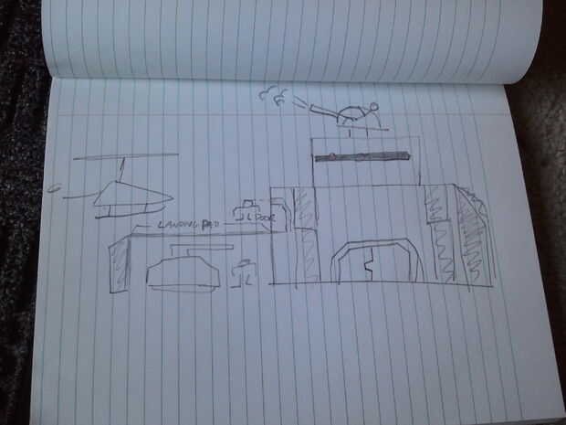 después de que ha reunido algunas de las fuentes principales que necesita hacer un boceto (si reúnen sus cosas antes de que el doodle viendo partes le dará algunas ideas locas) este es el boceto que hice, como veis tengo un bunker en la parte superior, una "plataforma de aterrizaje" para pequeñas embarcaciones y reparación de puertas lo suficientemente grandes como para alojar un tanque de depósito.