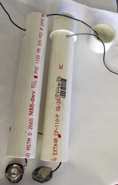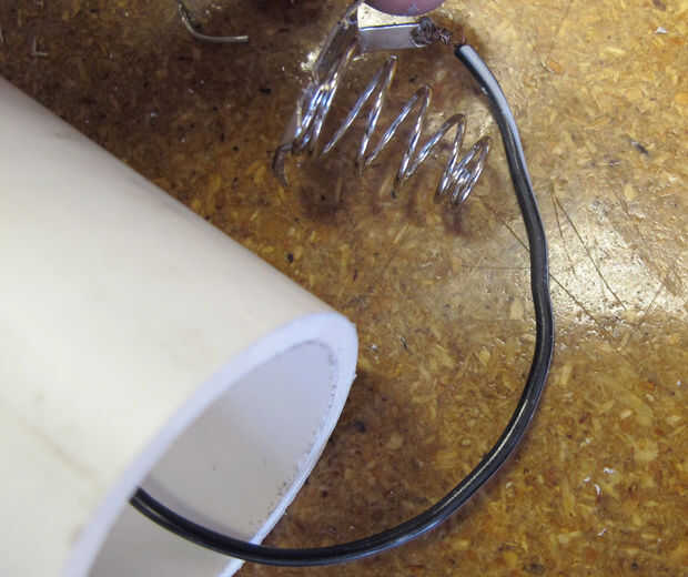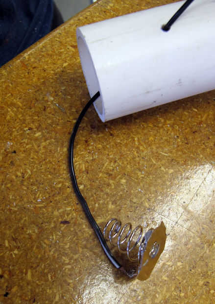 -Con el paralelo de los tubos y los tapones al ras contra la otra, el extremo del cable unsoldered que sale el otro orificio de la tubería, corte esta a unas 3 pulgadas de donde viene fuera del agujero, así se pega el tubo un poco.