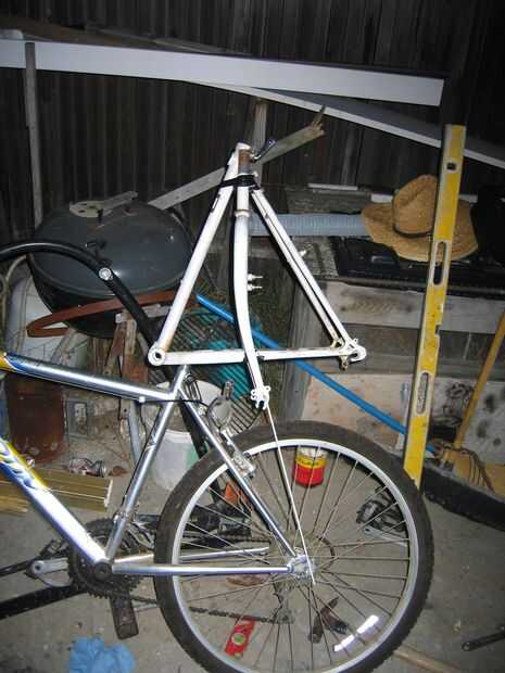 Poner el tenedor contra el triángulo superior. traslape el tubo de dirección con el racimo del asiento y coloque las láminas así poin a las punteras de la moto de abajo, ahora marca el ángulo que se te corte el dirección del tubo y hoyo del tubo del asiento, la longitud le va cortar los tirantes a pero contra la parte posterior de las hojas de la horquilla.