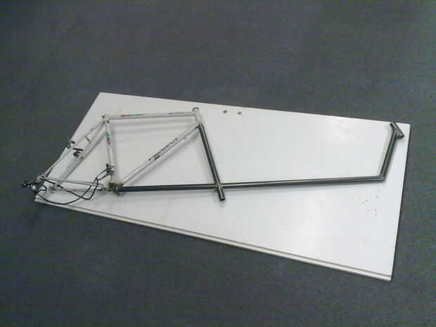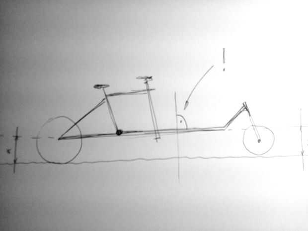 -Tenga cuidado que el tubo principal al frente paralela al suelo. Esto significa medir exactamente como sea posible las dimensiones de la rueda delantera y horquilla y el centro de la rueda trasera (ver dibujo)