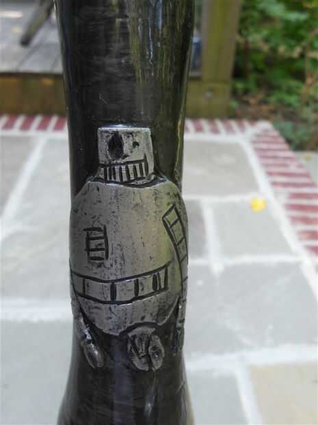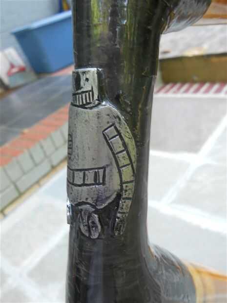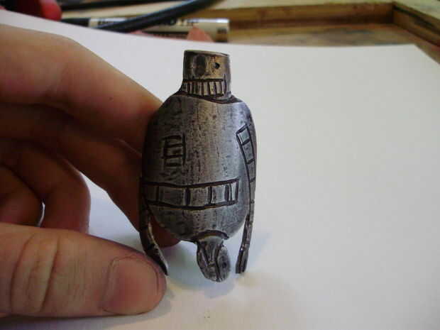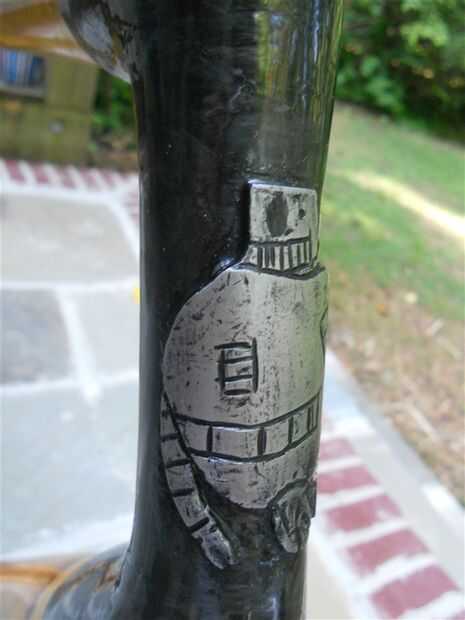 Este paso está lejos de ser necesario, pero una divisa principal agradable es una buena manera de separar su bicicleta de bambú de todas las demás.  Hice mía de un segmento de tubo de acero de la bicicleta del donante.  Una vez que surgió con un diseño (un Instructables Robot-esque uno), perforé la forma áspera de acero con una broca fina.  Entonces me fijo los bordes con un disco de corte Dremel reforzado.  Corté las líneas en la placa con el disco de corte así.  Para obtener las líneas para sacar, había coloreado sobre la insignia entera con un marcador sharpie y luego limpiar con un trapo.  La tinta se quedó en las grietas, dando el diseño cierta claridad.  A continuación poner una capa transparente de poliuretano encima y ajustaron a la barra de dirección.